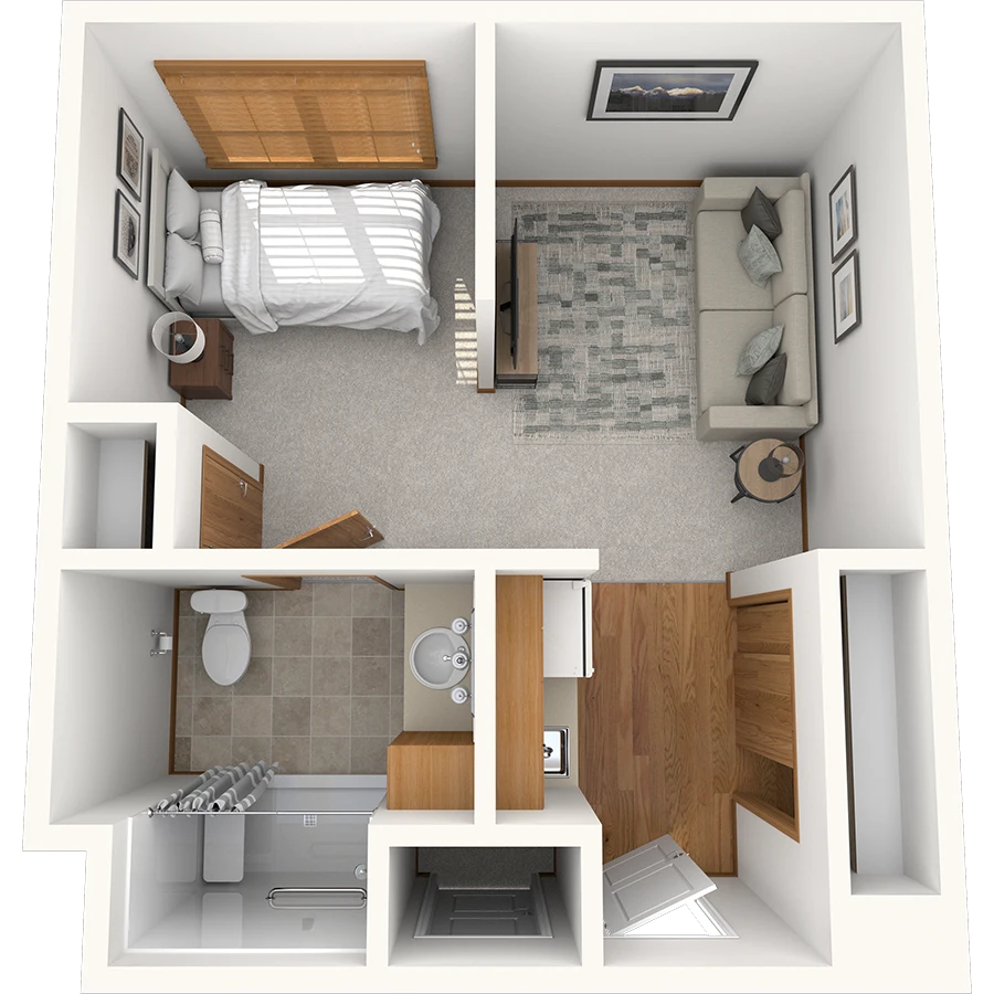The Courtyard’s apartments for assisted living residents offer a private living space and personalized care services. Unlike standard rentals, our residences include on-site support like medication management, help with bathing and dressing, meals, housekeeping, and 24-hour team member availability.